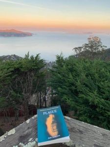 One point to make about Plague is how far it has travelled, only six weeks into its published life. I have received snapshots of it on the Isle of Skye, in deepest Dorset, in the flatlands of East Anglia and in various parts of the north of England. I have yet to see it in Wales, Scotland or Northern Ireland (though I know it has been read there, because I have seen reviews on Goodreads and Amazon from readers who live there). Plague has also travelled internationally, from the lawn of a Normandy chateau (left) to a Californian balcony over-looking San Francisco Bay (above), from an American Naval Base to a tapas bar in Jerez (admittedly, that one, below, was with me).