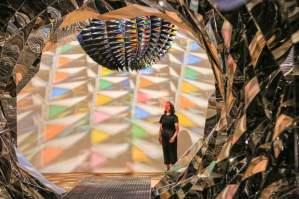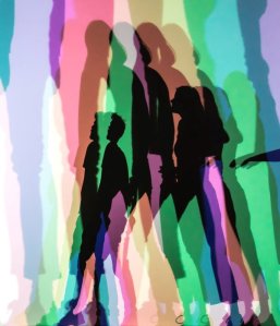 Room 2 also contains trickery in mirrors and glass, an insect’s eye glass and a mirror which is actually a hole.  This leads on to the Kaleidoscopes Room ( via a very interesting corridor which challenges the senses – I’ll say no more ). Here there are hanging reflective spheres and a walk-through corridor of reflections. Thence to a room with a projected, slowly transmuting image – all calm and tranquillity – followed by a room full of energy in which viewers find themselves part of an ever-changing art work on one of the white walls. It is so simple it seems effortless, but of course it isn’t.  Like Big bang fountain which is found in a small curtained-off room with no light at all save for a periodic strobe which illuminates a fountain, freezing the water into silver metallic images before the viewers’ eyes.
