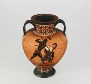 from the coloured figures, like those on the large two handled pot depicting Achilles killing Amazon Queen Penthisiliea (right) or the Judgement of Paris on a wine krater, to the delicate line drawings showing Briseis being led away from Achilles’ tent. I will also remember the stone bas relief showing this scene, with Achilles looking away in anger, but Patroclus placing a consolatory hand on Briseis’ shoulder as she is collected by Agamemnon’s soldier. A tender gesture.