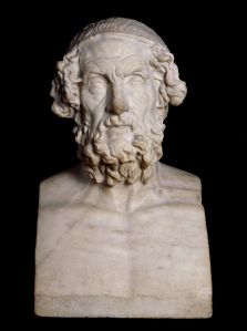 It is testament to the power of the ancient story that the characters live so vividly again. But then, the story has been told and retold, as evidenced by the lines from the epics scribbled by ancient Roman children on the papyri copy books displayed. Its retelling is brought bang up to date with the poster from the, much derided, 21st century Hollywood film Troy and modern versions of The Judgement of Paris – photographic – and The Siren’s Song ( see left for the ancient depiction, below for the modern collage by Romare Bearden ). Aficionados of the male body please note, Brad Pitt has quite a lot of competition in the buffed masculinity stakes, though it’s interesting that, even where a ‘hero’ such as Odysseus is obviously beyond youth and is depicted on artefacts with an older face, his body is still drawn as youthfully ideal. Hollywood’s fixation with perfect bodies is nothing new.