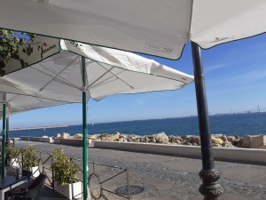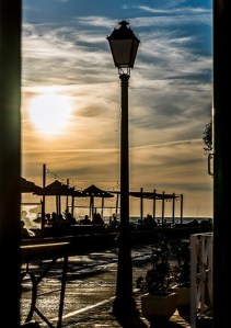 the Bay (see photos, courtesy of Deborah Powell) with a view across to Cadiz and one pays a premium for the location. When we visited there was the bonus of a tall ship. The people frequenting the bars along here are, largely, wealthy holiday makers and yacht owners, Spanish and foreign. The locals work in them. They were, however, extremely welcoming of Thai and Goa, Deborah’s two labradors. We sat and watched the sun set and the lights of Cadiz begin to glow.
